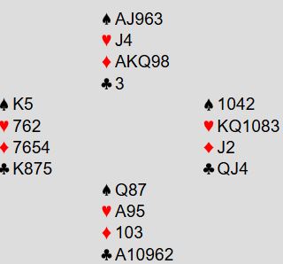 Vest må nok ha spar konge hvis dette skal ordne seg. Inne på hjerter ess må det spilles trumf. Men hvordan bør trumfen behandles? Liten til knekten fulgt av esset er en mulighet, og da kan trumftaper unngås om vest har spar konge dobbel. Men skjer det er det fortsatt mulighet for to tapere, en i hver rødfarge. Men at at det ikke blir rutertaper er det jo en bra sannsynlighet for.