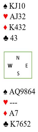 Her ser spillefører med det samme at kløver ess må sitte foran, hos øst. Siden det er dobbelton kløver hos nord vil det i så fall gå bra veldig ofte. Kløver må spilles før trumfen tas ut for at det skal kunne være igjen nok trumf hos nord til å trumfe kløver etter at esset og kongen er spilt. Sitter kløveren 3-3 med esset foran er en kløverstjeling nok til at resten står. Om kløveren sitter 4-2 må to stjelinger til, men det går fint det også. Hjerter ess gir riktignok et avkast, men det blir for mange kløvere å kvitte seg med, så det må trumfes kløver på den korteste trumfhånden. Det gir jo som kjent ekstra stikk, og samtidig vil det godspille den lange sidefargen.