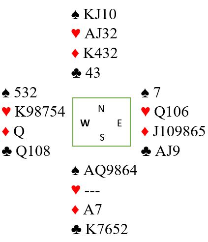 Hjerter kom ut og det var ikke lystelig for spillefører. Om han lasjerer andre gang hjerter kommer spar gjennom, og nord får godspilt hjerterfargen samtidig som N/S får draget på motspillet.