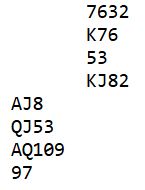 Etter dette hadde spillefører to sparstikk, tre hjerterstikk og fire ruterstikk, ni stikk totalt og +400.