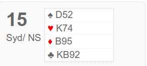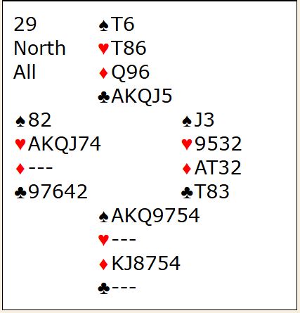 I hjerterkontrakt er det kun en taper i trumf og en i kløver i tillegg til at det blir bare en spartaper, for fra vest kan en spar kastes på ruter konge. Kun ett par var i 4 spar. De vant den etter hjerter ess i utspill som gjorde at N/S ikke fikk kløverstikk, det var inntak til øst for å hente ruter konge og kaste kløver fra vest. Om det spilles ut kløver får ikke spillefører kommet seg over for å tatt det avkastet. Det var en lang rekke +620 i hjerterutganger, og det ga middels. Noen få par fikk fatt i ett overstikk og noterte med det 60%. Ett par fikk 70% for +660 i 3NT, en kontrakt som er håpløs om det kommer kløver ut.