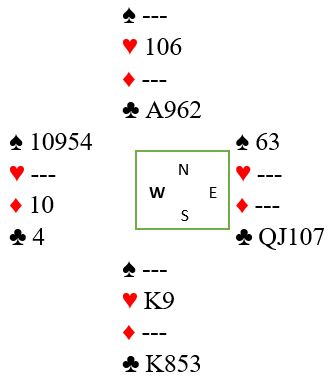 Øst spilte altså hjerter 4 som tok med seg tieren, kongen og esset. Kløverstikket ble innkassert, så resten av trumfene. Før den siste trumfen så det slik ut:
