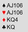 Merk at om det startes med liten kløver fra nord og øst ikke kommer på med en stor en må syd legge åtteren. Med sitsen i det siste diagrammet står i så fall åtteren. Og om vest kan stikke må han spille kløver tilbake (eller til dobbeltrenons) og det blir 100% på samme måte som i varianten under det fullstendige diagrammet. Og om øst har den Q-J-10-x kombinasjonen og du starter med liten fra nord kan jo øst legge i en stor en, for eksempel tieren. Syd kan stikke (det går faktisk bra å legge liten fra syd i det stikket også), og dette er igjen: