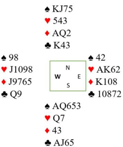 Vest spiller ut hjerter knekt som går til østs konge. Han fortsetter med hjerter ess og en hjerter til som syd trumfer. Ikke tenk på å trumfe høyt her, for det er nok større sjanse for 4-0 i trumf (da får du trumftaper om du trumfer høyt) enn at øst har passet i åpning med A-K sjette i hjerter i gunstig sone. Så vest kommer til å følge farge i tredje hjerterrunde.
