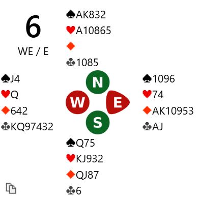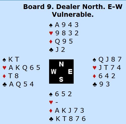 Det var perfekt tilpasning og en nydelig lilleslem Bilde-Schaltz hadde meldt med kun 20 HP (!) til sammen. Spilleføringen var en formalitet siden trumfen ikke satt 3-0. Det ble meldt utgang ved det andre bordet der Hoftaniska og Heiberg-Evenstad satt Ø/V, så spillet ga 10 IMP til DE BOTTON i kampen som ble vunnet med 42-16.