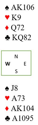 Om dette hadde vært lagkamp så ville spilleføringen kun vært interessant i 4NT, for det er jo ni sikre stikk i NT uansett rutersits. I 4NT må man få fatt i ett ekstra stikk i ruter. Etter hjerter ut til esset og kløver tilbake kan det en sjelden gang bli bet i 4NT om en ikke spiller safe. Safevarianten er ruter ess, så over til syd og liten ruter. Om vest følger med liten legges nieren. Ryker den til østs tier sitter fargen 3-2 og resten av ruteren står. Men om vest har D-10-x-x har man sikret seg det niende. Sitter det sånn vil å spille A-K gå galt. Vest får i så fall to stikk i ruter og rekker å godspille ett stikk i kløver før spillefører har gått godspilt det tiende stikket. Og om øst har D-10-x-x i ruter oppdages det idet liten ruter spilles mot nord i andre ruterrunde. I så fall stikkes med esset fulgt av ruter mot knekten som godspiller fargen.