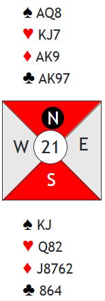 Kontrakten bør bli 3NT eller kanskje 4NT med disse N/S-kortene. Nord har en super hånd, 24 HP og "rene" honnører, men også flat fordeling. Noen viste 22-24 NT, andre 24-26 alt etter systemavtaler, eller kanskje enkelte oppvurderte (hardt) til 25-27. Om nord viser 22-23 (24) har ikke syd til å tenke på slem. Men om syd får høre om 24-26 kan det være en bra slem, men det er det ikke så ofte med 31-32 til sammen og to balanserte hender. Så mot en 24-26 hånd er det nok å høyne til 4NT som kvantitativ høyning (invitt), og da har ikke nord til å ta imot invitten.