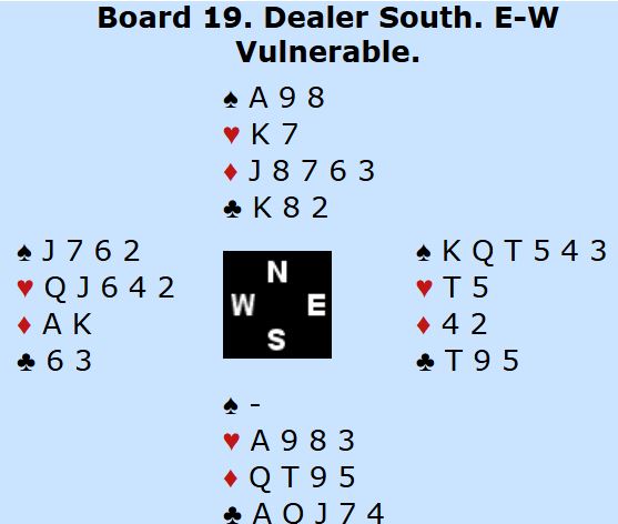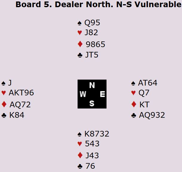 Tolle Stabell sa 1 ruter, motparten kom med med 1 hjerter, og Leif Erik Stabell viste ruterstøtte og god hånd med såkalt cueraise, 2 hjerter. Syd fikk også vist kløverfargen etter at øst meldte spar. Ø/V var i med til 4 spar (som er to bet), men nord meldte da 5 ruter. Naturlig nok doblet vest med to bombesikre stikk i trumf, men det var de eneste stikkene Ø/V fikk, Norge +550.