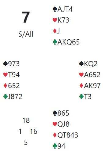 Som du ser ville hjerteren blitt løst med kun to tapere slik det sitter. Så denne utgangen ville mest sannsynlig blitt vunnet av de fleste klubbspillere. Som du også ser funker også den planen vi nevnte med å ta kun to runder trumf og spille kløver mens en motstander har igjen en trumf. Nord som blir sittende med den siste trumfen må følge farge idet kløverhonnørene spilles så vests fjerde kløver kan trumfes hos øst og det er ti sikre. Da blir det fort elleve stikk også siden hjerteren sitter fordelaktig.