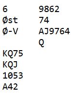 Både 6 spar og 6 ruter er hardmeldt, men med bra sjanser. I 6 spar må sparfargen være uten taper. Da er det 5+0+6+0 sikre stikk, så et hjertervalg må til for å få det tolvte. For å få stjålet hjerter hos syd (ekstra stikk) medfører problemer da man risikerer ruterstjeling, og en kan fort miste kontrollen.