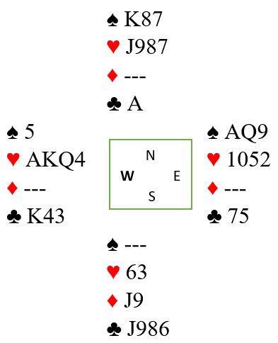 Hvis det spilles liten kløver til det single esset nå blir det kun elleve stikk, for nord spiller spar. Finessen kan tas, men spillefører blir ikke kvitt både hjerter 4 og den ene lille kløveren han har igjen. Det må i diagramsituasjonen spilles spar til nieren etterfulgt av nå først en elegant liten kløver fra begge hender mens spar A-Q får ligge der borte på bordet som det egentlig ikke er flere inntak til! Kløverspillet går til det single esset, og så må nord hjelpe spillefører samme hva han gjør. Spiller han hjerter vinnes med østs tier. Så tas spar ess med avkast av den gjenværende lille kløveren hos vest. Vest har igjen kun A-K-Q i hjerter og den godspilte kløverkongen. Hvis nord inne på det singel kløveresset i stedet spiller spar får spillefører tatt enda en finesse med damen. En hjerter forsvinner i det stikket, og på spar ess forsvinner vest lille kløver - og resten står!