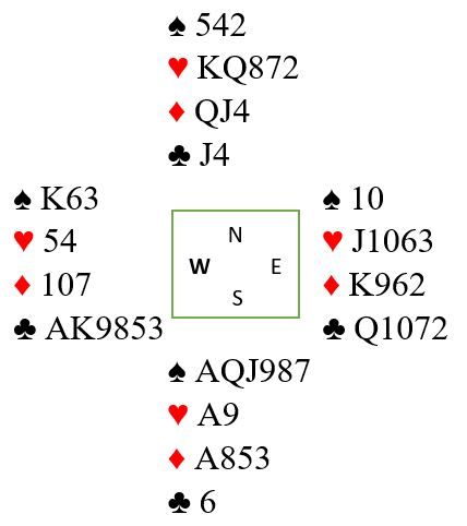 Da spillet forekom så den nokså uefarne spilleføreren at det kunne gå bra om hjerteren satt 3-3. Så i full fart fulgte to ganger trumf for å ta bort vest sine trumfer, så tre ganger hjerter i håp om 3-3 sits. Men da ble det kun 10 stikk siden det ble en rutertaper til slutt.
