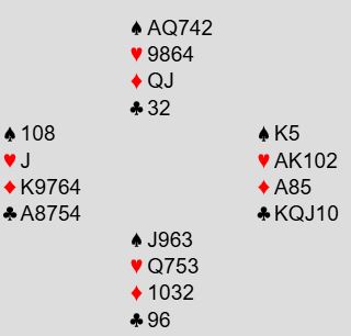 Å spille 4 hjerter som Ø/V virker normalt. Det går an å vinne tolv stikk. Men da må spillefører ta ut trumfen i fire runder og deretter løse både sparen og ruteren uten taper. Kanskje får man spar ut sånn at den fargen er løst. Men det er fortsatt litt ekkelt, for spillefører har igjen kun en trumf etter uttrumfingen. Så det går an å miste litt kontroll på det hele, for det er sårbart om øst blir kortet i trumf. Det er nok lettere å spille 4 hjerter om syd har vært innpå med et svakt innhopp i spar.