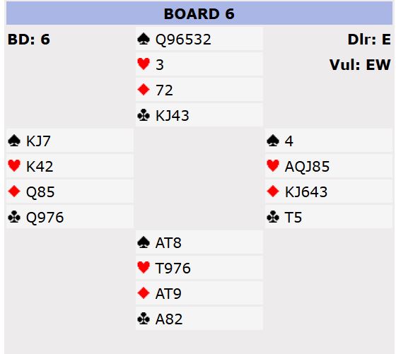 Idet spar 9 ble spilt oppstod en tosidig skvis. Øst som måtte kaste før syd måtte holde hjerteren sin og følgelig gå ned på singel ruter. Da forsvant hjerter 10 fra syd, og det var vest sin tur. Han måtte holde kløveren og derfor forsvant en ruter fra han også! Dermed satt ruteren 1-1 til slutt, og ruter 10 ga det tiende stikket. Pluss 590 ga 12 IMP siden N/S spilte 4 spar udoblet med en bet ved det andre bordet.