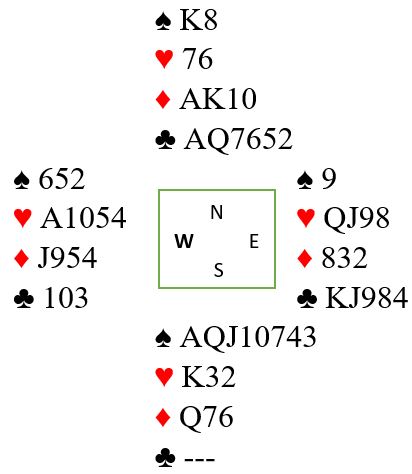 Selv med denne ekle kløversitsen og hjerter ess bak kongen blir det altså tolv stikk: syv i trumf, tre i ruter og to i kløver =12. Det skjer fordi vi fikk ruter ut, og dermed fikk maksimalt ut av innkomstene. Spar 8 viste seg å bli et nøkkelkort!