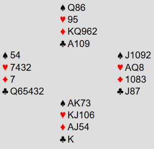 Hvordan melde disse kortene avhenger av system, og grad av optimisme. Sunnfjords Jonill Storøy (syd) var optimistisk nok og gikk rett i 4NT (spørsmål om nøkkelkort) etter 1 ruter - 2 ruter som var omvendt minorstøtte. De ble spillende 6 ruter med syd som spillefører.