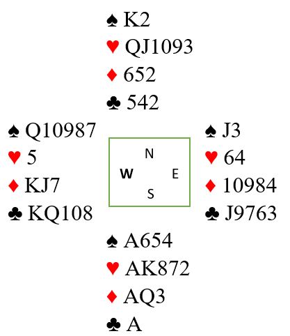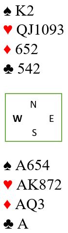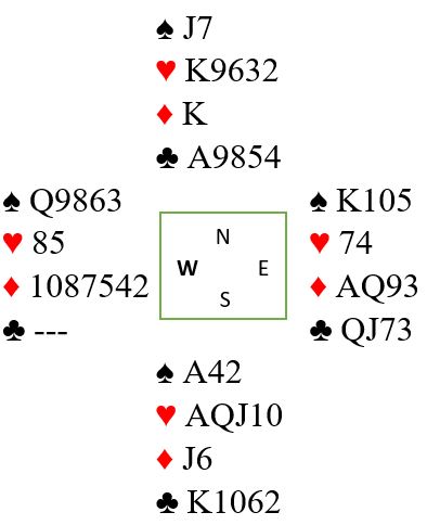 Nå spilles spar 6, og det stikkes overlates generøst til vest idet en ruter forsvinner fra nord. Det stikket er kun et bytte, du får en spartaper i stedet for en rutertaper som ikke kan unngås uansett. Og nå er vest innspilt for å måtte spille ruter til saks, eller et kort til dobbelrenons som trumfes hos syd med avkast av nok en ruter fra nord. Tolv stikk.