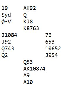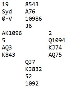 Syd valgte opp oppvurdere sin hånd til 18-19 NT pga. den gode ruterfargen. Da fikk vest meldt inn 1 spar over syds åpning 1 ruter, men syd ble etter hvert likevel spillefører i den normale utgangen 3NT.