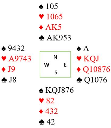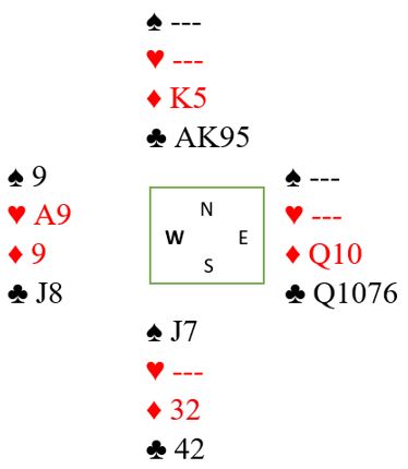 Mot 2 spar spiller vest ut ruter knekt, makkerens farge. Det ser ut som ni stikk med en spartaper, to hjertertapere og en rutertaper om ikke kløveren kan utnyttes. Ruter ess vinner første stikk, så spar til østs ess. Derfra kom de fleste steder tre ganger hjerter, og syd stjal tredje gang. Så tas trumfen ut, og vest må følge tre ganger. Underveis sitter nok syd og tenker at det var fint de ikke tok ut nords andre ruterhonnør, for her kan det kanskje bli ti stikk ved å bruke sin siste trumf til å stjele godt kløveren som kan sitte 3-3. Og nords andre ruterhonnør er fint å ha i behold som inntak. Kløveren satt imidlertid ikke, men det oppstår en søt posisjon idet den fjerde trumfrunden spilles: