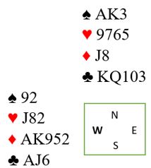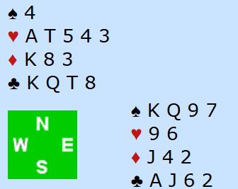 Syd havnet i 3NT etter at vest hadde vært innpå med 1 hjerter over syds åpning 1 ruter. Hjerter 2 (norske) kom i utspill til østs dame. Syd lasjerte selv om det kunne blitt ubehagelig med kløverskift, men det skjer neppe. Øst fortsatte med hjerter. Nå var det på tide å vinne med esset, for hjerteren sitter temmelig sikkert 5-2, så forbindelsen mellom øst og vest er allerede brutt i hjerterfargen.