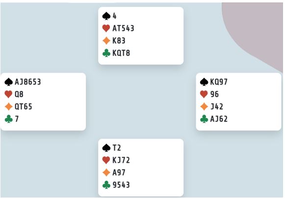 Idet spar 10 spilles blir vest skviset sønder og sammen. Enten må han kaste hjerter konge slik at spillefører får for kløver ess og hjerter 10 til slutt, eller vest må kaste en kløverhonnør. Gjør han det forsvinner hjerter 10. Kløver 3 til esset tar med seg den andre honnøren, og kløver knekt gir det tolvte stikket.