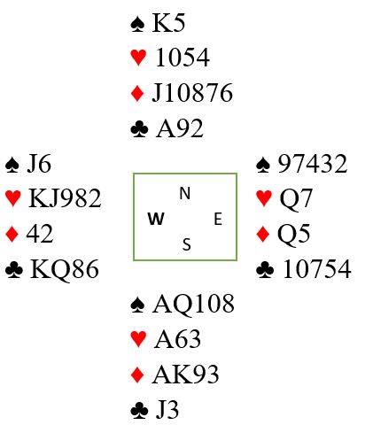 Isolert sett bør en sånn ruterfarge toppes. Det skal dog ikke mye til før det er riktig å legge ned en honnør før man går over til den andre siden for å ta finessen. Det kan være bra spilt hvis man har tro på at den som en eventuelt tar finessen gjennom har lengde i den fargen som skal løses. Her har vest femkorts hjerter mens øst har kun to. Det med «ledige plasser» tilsier derfor at øst er litt favoritt til å ha lengde i ruter. Men du vet ingen ting om lengden i de andre fargene, og dessuten er det en meget god grunn til å slå fra seg den fristende, men risikable ruterfinessen. For kontrakten er bombesikker med kun fire ruterstikk hvis vest som nå har tre godspilte hjerterstikk ikke får komme inn. Derfor bestemmer du deg for å denge ned de to ruterhonnørene. Hvis vest har maks tokorts ruter er utgangen sikker. Om øst har damen tredje må du i så fall gi bort ett stikk i ruter, men vest får ikke komme inn. Etterpå er det ni sikre, og fortsatt mulighet for overstikk.