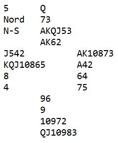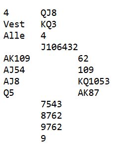 Merk at selv om nord finner ruterutspill, eller liten kløver kan 6NT vinnes. Nord som er alene om å holde tre farger får fryktelig pustebesvær på fem ganger ruter. Det oppstår en skvis og trolig en gjentatt skvis også så det kan bli tretten stikk! Men det går jo an å gå seg bet i 6NT om en velger å ta dobbelfinessen i spar eller hjerter. Av de 48 Ø/V-parene i 1. og 2.divisjon gikk ni par bet i slem. 16 par vant slem og resten spilte utgang.