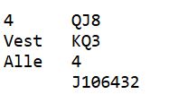 Dermed fikk Ø/V spille 5 hjerter, og da nord prøvde å ta kløverstikk ble det tolv stikk; Rogaland +480, og spillet ga dermed 13 IMP til Midt Trøndelag 1.