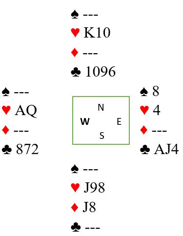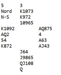 Ruter dame kom i utspill ved de fleste bordene. Spillefører får etter hvert trumfet sin tredje ruter hos vest. Det er jo tre toppstikk i kløver siden damen faller under kongen (eller esset), og nord blir med riktig timing utsatt for en skvis. Forskjellige sluttposisjoner kan oppstå, og det kan spesielt interesserte pusle litt med selv. For eksempel kan vi se på en mulig sluttposs uten at spillefører har gjort noe annet enn å trumfe den nevnte ruteren med trumf hos øst, og tatt ut trumfen. I det diagrammet her har også spillefører tatt for kløver konge, og dette blir igjen: