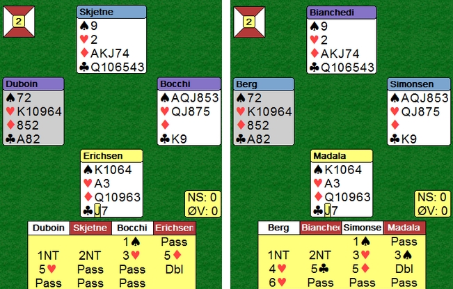 Det italienske laget var rett og slett bedre enn de norske i den BBO viste 32 spillskampen i kvartfinalen. Gode lag er heldige og når de norske i tillegg gjorde et par dyre feil ble det seier 69-29 til Lavazza. Lag Erichsen skulle gjort VELDIG mye rett for å ta igjen de 40 IMP'ene. I skrivende stund er ikke resultatet fra DeButton sin kamp lagt ut, men du finner det sikkert her i løpet av kvelden.