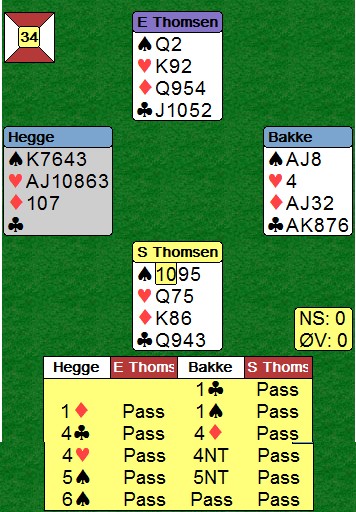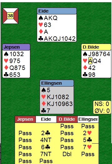 Det var en gysare av en kamp i semifinalen mot Danmark. Jeg fikk sett den siste sesjonen og det var mer enn nok for oss med frysete nerver. Bridgen fra de norske varierte fra det glimrende til det nesten komisk dårlige. I innledninga av turneringa har det virka det som om Harald Eide og Kristian B Ellingsen har bært båten, men i de siste spillene bør de takke sin lagkamerater, Christian Bakke og Kristoffer Hegge, for at de kom til finalen. Seier med 2 IMP!!