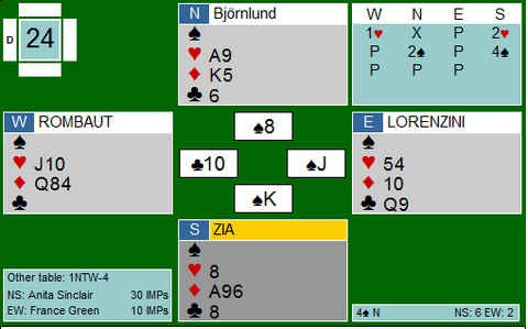 Øst spilte ut hjerter tre til dame og konge. Kongen fikk beholde stikket. Kløver knekt var en fin skift som gikk til kongen. Spar mot damen var rett siden esset satt singel. Mer kløver til esset, spar dame og spar til tieren. Ruter knekt fra hånda (!!) vrengte den finessen og vant stikket. Spar konge tok ut siste trumfen og vest må kaste kløveren sin for å holde de røde fargene. (Posisjonen til under)