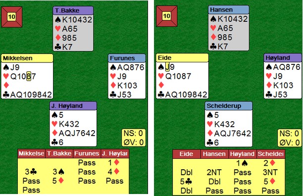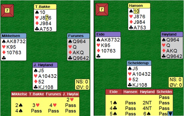 Her var Geir Helgemo flinkere til å spille ut enn Ole Johnny Tøsse på det andre bordet. Meldingsforløpet var ikke identisk, men begge måtte trekke et kort, en kløver eller en hjerter. Geir og Erik tok de fire første stikkene etter hjerter til konge og ess, to ganger ruter og hjerter knekt. I lukket kom det kløver ut etter 1sp 2NT 3ru 4sp 11 lette stikk. |