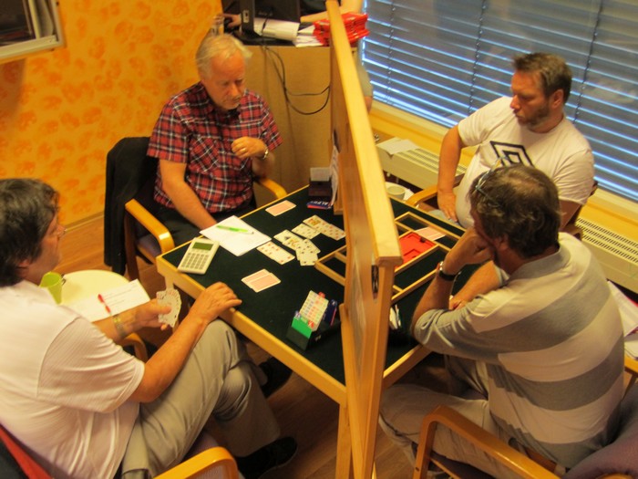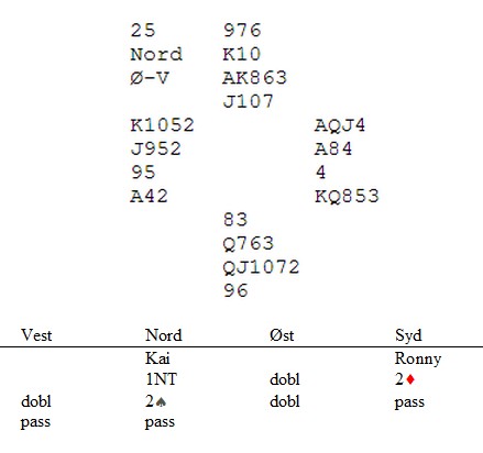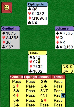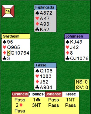 Så en katastrofe av Grøtheim - Johansen. Syd åpnet med svake to spar og så vet vel ingen hva som skjedde videre. 3spx kosta ikke mindre enn -1400. (Mente øst at de spilte samme forsvar som etter 1NT inn kanskje? Da betyr redobler at han har en langfarge, mens dirkekte melding viser fargen + en overliggende) |