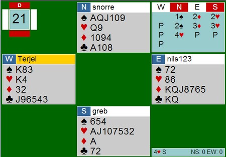 Her er alle kortene og du ser at jeg trøkka på kontrakten. Øst kunne vunnet kontrakten med et innspill på meg i sluttpossen og beholdt Dx i kløver. Det smerter om mulig enda mer at han i stedet regna med at jeg egga!! |