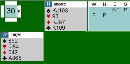 Jeg kan ikke spille spar eller hjerter fordi da rekker øst å godspille den trettende sparen og har får to i spar, tre i hjerter og de to minoressene. Derfor må jeg spille kløver for å sette opp et stikk der før spartassen er godspilt. |