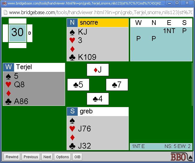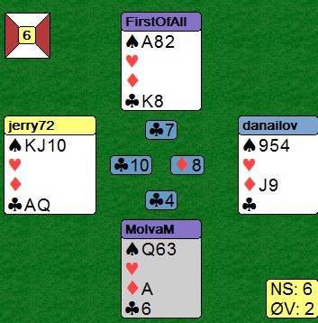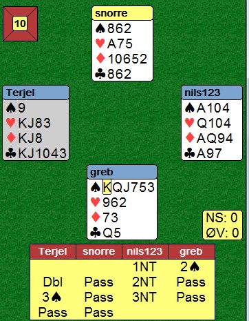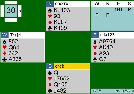Øst startet med kløver 9 som vest lot nord vinne med knekten. Han tok for KD i ruter (vest kasta en hjerter) og spilte hjerter til kongen. Spillefører måtte la ruteresset ligge selv om bordet var uten opplagt inntak og fortsatte med hjerter til dame og ess. Nå burde kanskje øst skifta spar, men det kunne fort vært feil å åpne den fargen når bordet som sagt ikke hadde inntak, så han spilte heller mer hjerter. Enda en hjerter og posisjonen er som under. |