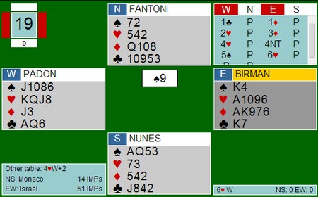 I følge butleren hadde italienerne slitt de første rundene og lå godt under middels etter fem kamper. Så skulle Fantoni spille ut mot 6hj og trakk vel egentlig bare et kort opp av hatten. Vel hadde Israel meld både ruter og kløver, men den første i øst vise i alle fall hjerter. Spar var det eneste beitende utspillet og det ser du at Fantoni fant. I neste kamp scoret de 55 pluss på butleren og de spilte også begge halvrundene i bronsefinalen. Suksess avler suksess, bare spør trønderske skiløpere!!