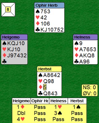 Peter Marstrander - Tolle Stabell satt NS og gikk inn med en tøff 2NT. Vest sin dobling var styrkevisende, men når syd spurte om hva øst sin dobling av 3ru betydde svarte øst at "Det har vi ingen avtale på". Syd ville med sitt spørsmål vite om øst hadde trumflengde og dermed straffedoblet, men øst ville ikke fortelle hvor mange trumf han hadde. Det var Håkon Kippe og Petter Eide som satt ØV.