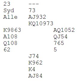 Så skal jeg publisere en mail fra Baard Olav Aasen. BOA er svært kritisk til min skepsis og mener jeg er konservativ og reaksjonær. Det har han både rett og feil i, men når jeg ser fasiten han kommer med blir jeg enda mer sikker i min sak. Bridge er vanskelig nok i seg selv om en ikke skal legge dype feller for seg selv og makker. Nesten så jeg mener at en legger opp til å skyte seg selv i foten. BOA kommer til å gå fra konseptet når han ser hva jeg mener, men jeg stikker fingeren i jorda og sier at vi er ikke bedre enn det vi presterer ved bordet. Uansett hvor lange og flotte systemkompendier vi har.