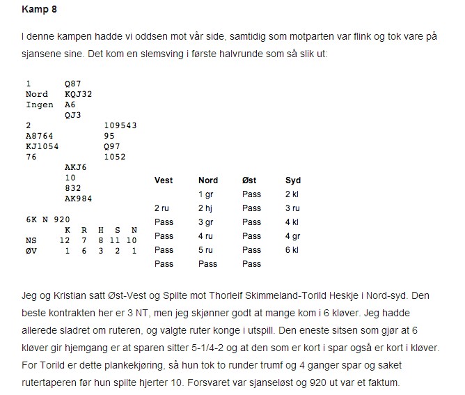 ....... | Under til venstre ser du meldingsforløpet til Baard Kåre Græsli og Kåre Bogø. De er et coming par som vinner masse både sammen og hver for seg. I mine øyne var de heldige som havna i toppkontrakten. 2ru fulgt av 3NT viste 25-26, men når han hoppet til 5sp over 4hj (overføring) måtte han kanskje enten ha telt feil eller oppdaget ekstra ressurser? (Du hadde da virkelig 28 hp, Kåre?) Græsli hoppa til 7sp og det var innertier. Denne gangen tetta hjerterdamen makkers farge, en annen gang er det en minordame som må til. Var Bård Kåre virkelig sikker på at de hadde alle essene? Under til høyre er det Aleksander Flagstad som "skryter" av meldingsforløpet til han og makker Jørn Arild Ringseth. Makker viser 28hp og sammen med hans 9hp blir det 37hp. En av majorkongene kunne vært borte i stedet for ruterdamen og kløverknekten som aktuelt var hos NS. Nesten så jeg vil bruke ordet flaks!! All denne gjettinga bare for at 2kl - 2M skal være passbart. Jeg er i alle fall 100% sikker på at jeg ikke vil betale prisen, fordi jeg melder steinalderbridge på denne måten.