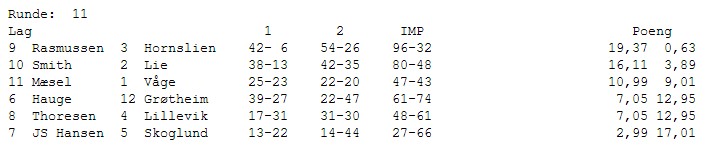 Gratulerer med et suverent mesterskap til Hauge. Grøtheim får i de siste spillene inn akkurat de IMP'ene de trenger for å ta andreplassen. Det samme gjør Rasmussen og de kniper bronsen foran et skuffet lag fra Møre. Det som en stund så ut til å bli gull, ble til slutt en sur fjerdeplass.