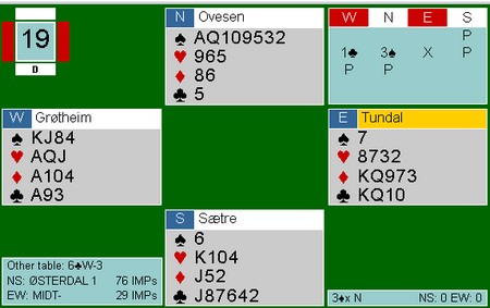 Det er alle som sier at sterke kløversystemer rakner når en får innmeldinger i mot. Det stemmer sikkert noen ganger, men her fikk Grøtheim - Tundal effektivt straffet Steigrim Ovesen's innmelding. 3sp kosta 800 siden spillefører aldri kom inn i bordet og fikk kun fem sparstikk. Dette spillet skriver Nils Kvangraven om på sin side der Bjørn Bentsen vinner 6ru etter spar ess og mer spar i utspill. Han røffer med kongen og kapper ruter på tieren. Så litt fram og tilbake for to hjerterkapper og tolv stikk. |