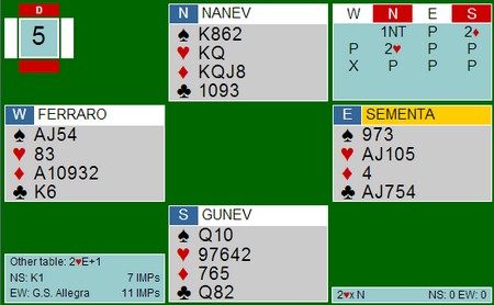Stefanov i øst spiller ut sin single hjerter fordi han vet ingenting om hvilken av de andre fargene som ikke kan gi favør. Ferraro spiller to ganger hjerter og så en spar fra bordet. Øst kommer inn på esset og må gjette hva slags farge han skal returnere. Hva er rett?