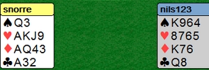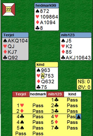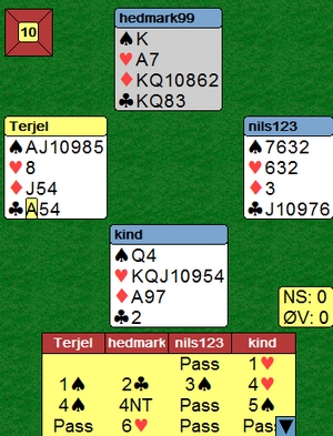 Litt lenger nede skreiv jeg om et spill der Roar Voll og Asbjørn Kindsbekken kom i 6hj med to ess vekk. Terje og Nils ville ikke være dårligere.