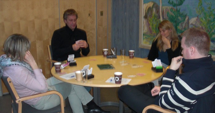Meldingsforløpet oppe til høyre er østerrikerne sitt, mens Allan og Terje melder nede til høyre. Vest hopper over en anemisk sparfarge, men det er det da ingen grunn til? 4-4 i spar spiller nesten alltid bedre enn NT. Terje og Allan får også NT'en på rett hånd, den som har oppspillsverdier.