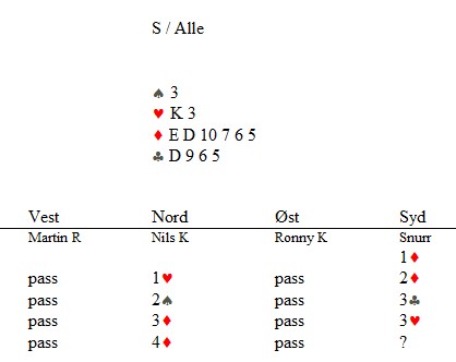 Jeg innser at jeg tok feil i dette spillet. Nils kunne hatt mer hjerter, slik at han trodde hjerter kunne være trumf i det videre meldingsforløpet. Han ville fastlegge ruteren entydig som trumf og se om jeg kunne gå på en gang til over 4ru. Meldte jeg 5ru passet han og cubidda jeg hj/sp, havna vi i 6ru hvis vi hadde ess nok. Hva som er rett over 4ru, er ikke lett. Kløveren er fort nøkkelfargen, fordi den må i spill hvis ikke en kan leve av hjerteren. Dxxx er dårlig, DKnxx hadde vært mye bedre.