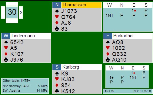 Dette spillet er fra forrige helgs landskamp mot Ungarn og Østerrike. BBO er avslørende og viser at noen kortspillere er flinkere enn andre. Østerrikerne viser dårlige vurderinger i både meldingsforløp og i spilleføringer, mens Norge gjør fine prestasjoner ved begge bord.
