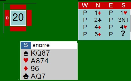 «A. Har dere minst 8 kort til sammen i en minorfarge, er en ny farge under tre grand primært et forsøk på å havne i beste utgang; hvis man går tilbake til makkers major, er det et naturlig trumfforslag, mens en ny farge over tre grand er sleminviterende cuebid med den avtalte 8 kortsfargen som trumf».