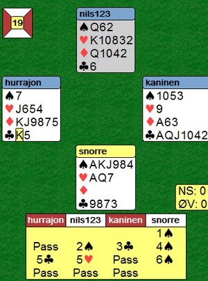 Han leser meldingsforløpet glimrende og det som var en normal 2sp-melding for å vise støtte og ca. 6-9hp, har blitt en monsterhånd. Å la motparten spille 5kl er uaktuelt, fordi det kan fint stå hvis de har rutertilpass i tillegg til kløveren. Hvis vi har hjertertilpass, er det godt mulig vi kan ha slem. Jeg er ikke veldig begrenset med min 4sp, så 5hj synes jeg er godt meldt .